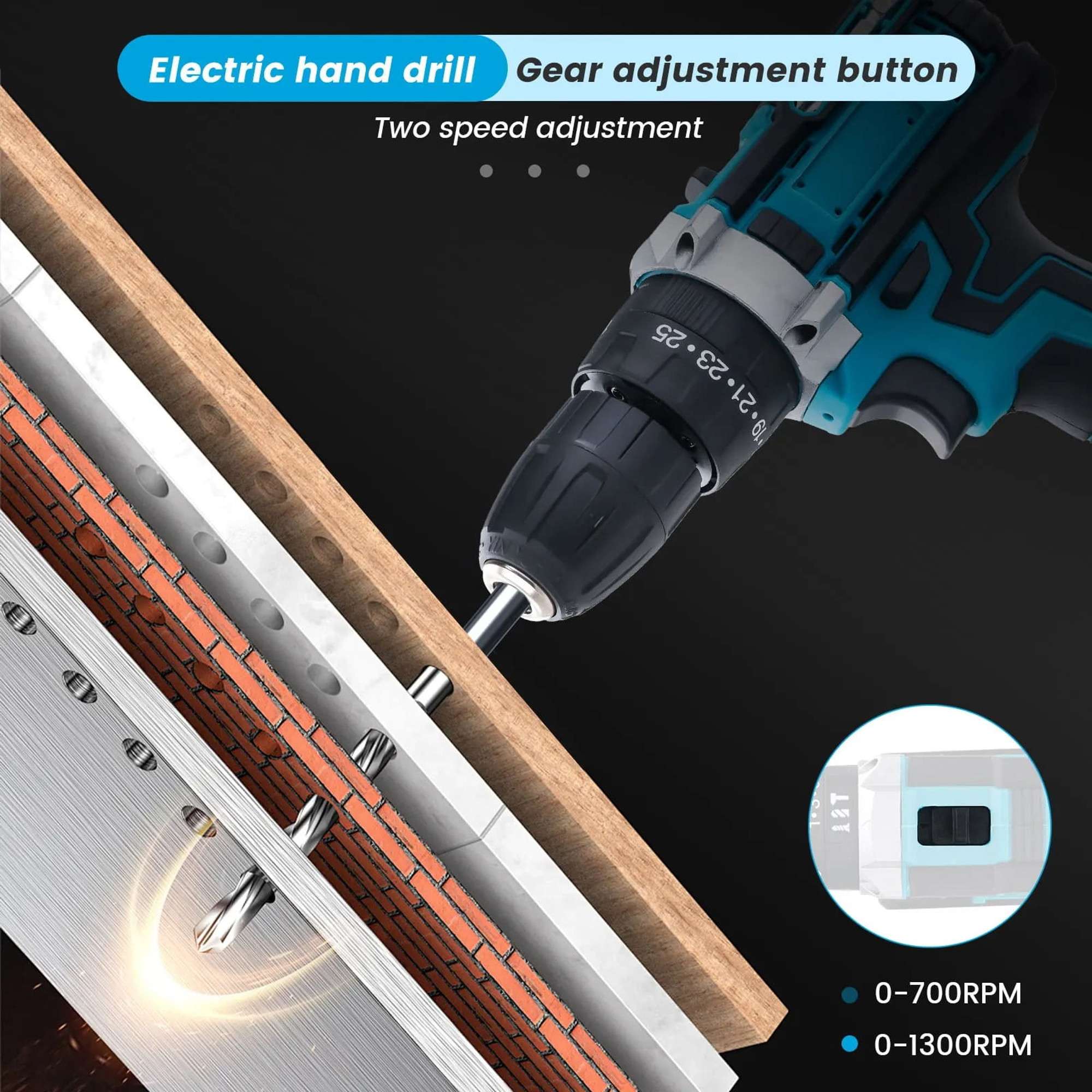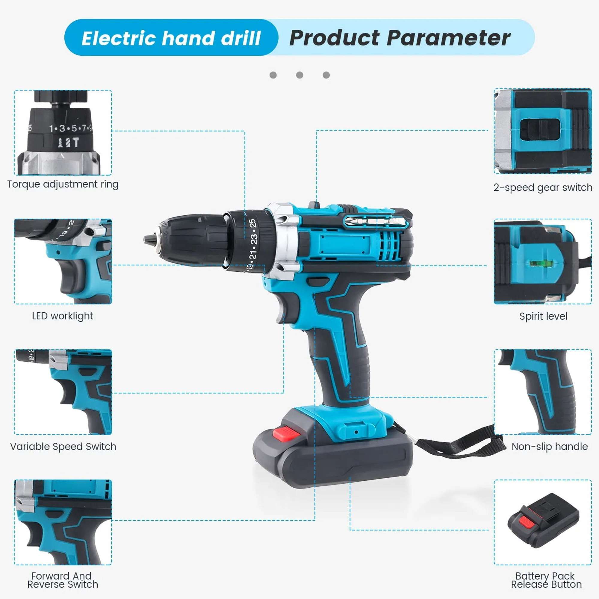 Ova aku bušilica ima ugrađeni motor s četkicama, ista ima veliku snagu, veliku torziju i veliku brzinu, s 2 promjenjive brzine, što osigurava veću učinkovitost.