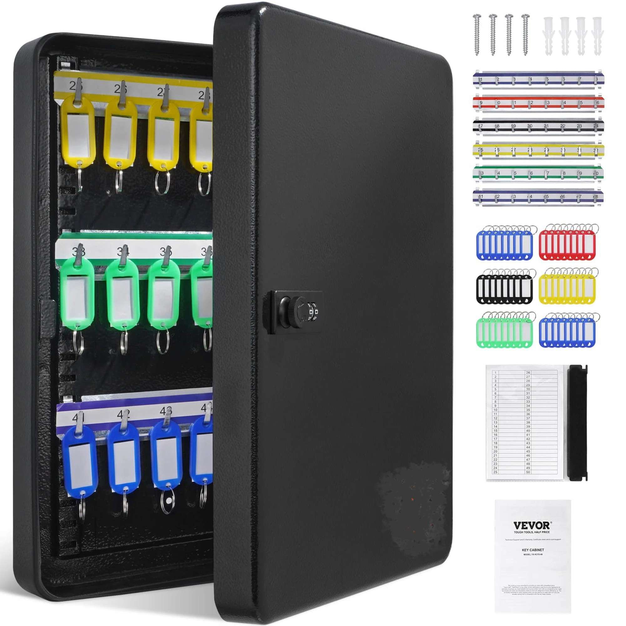 Upotreba na raznim mjestima: Opremljen karticama za evidenciju ulaska i izlaska ključeva i 48 šarenih oznaka za ključeve, lako je kategorizirati i upravljati vašim ključevima. Kartice za evidenciju pomažu vam pratiti korištenje ključeva, pružajući uvid u aktivnost ključeva.